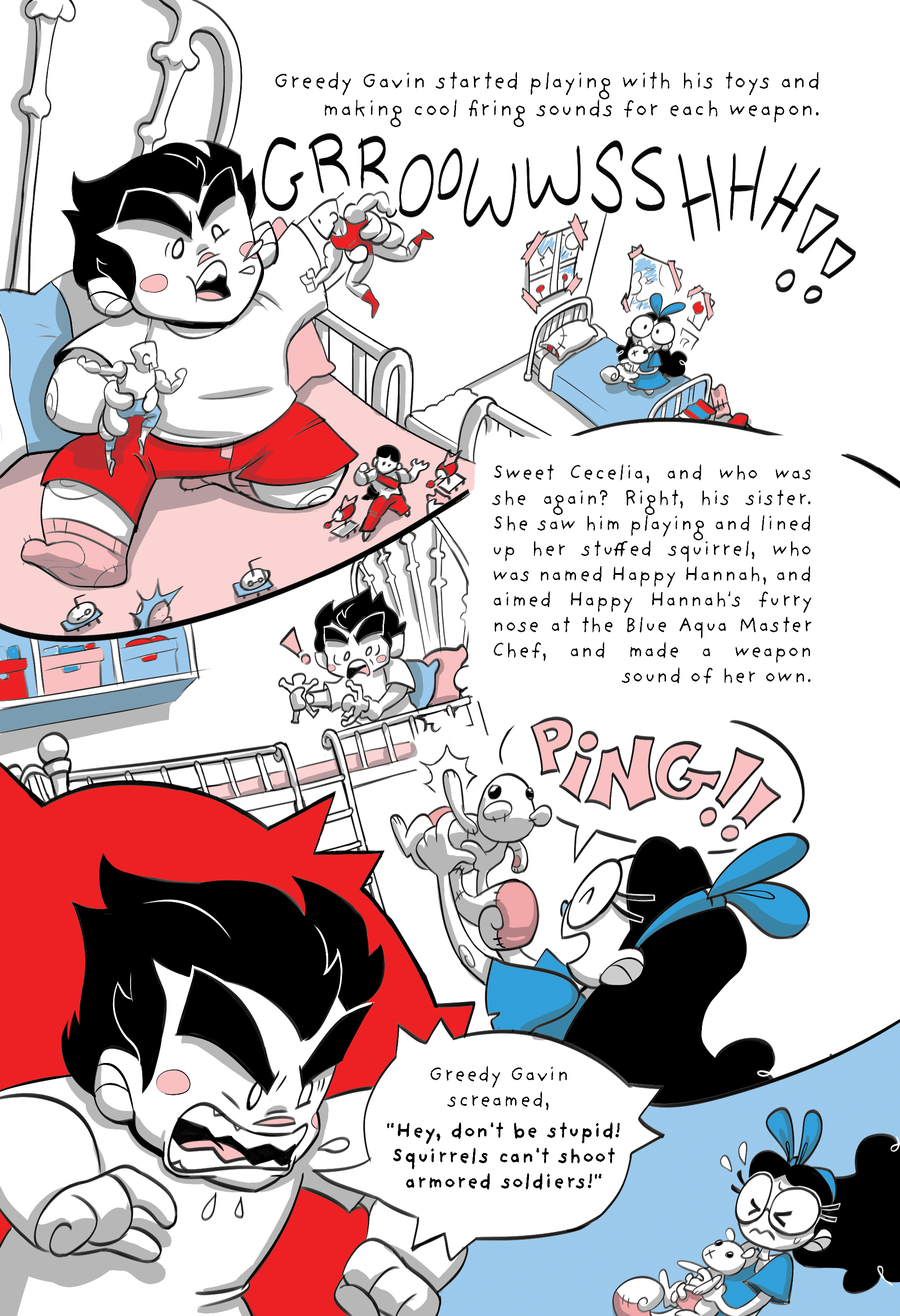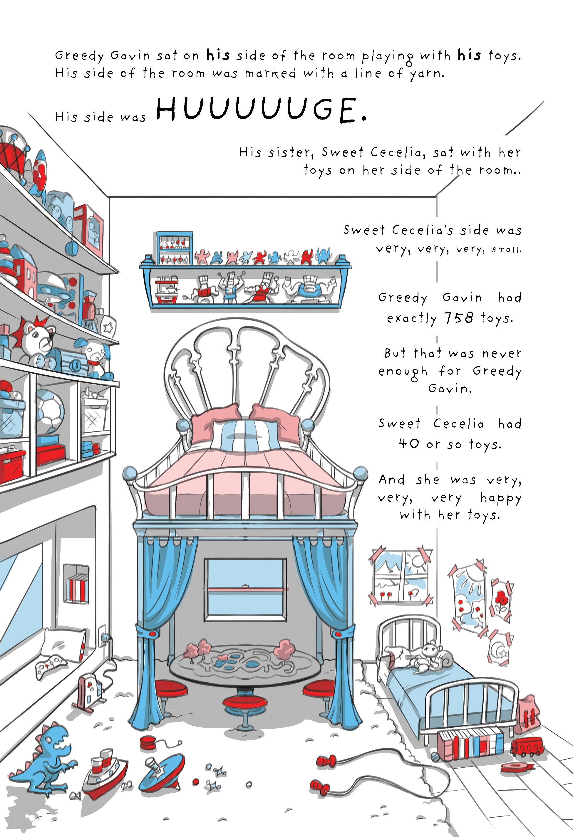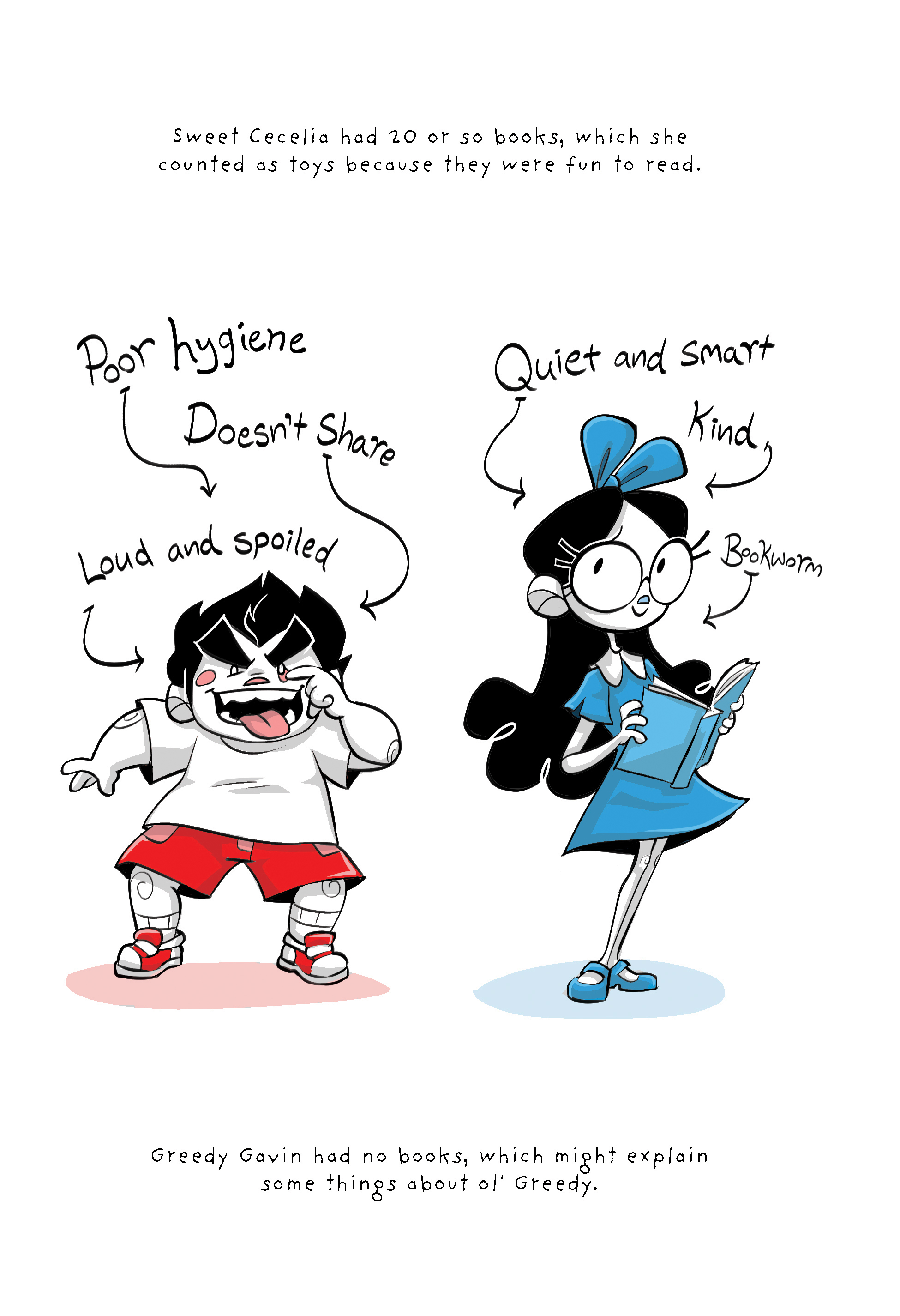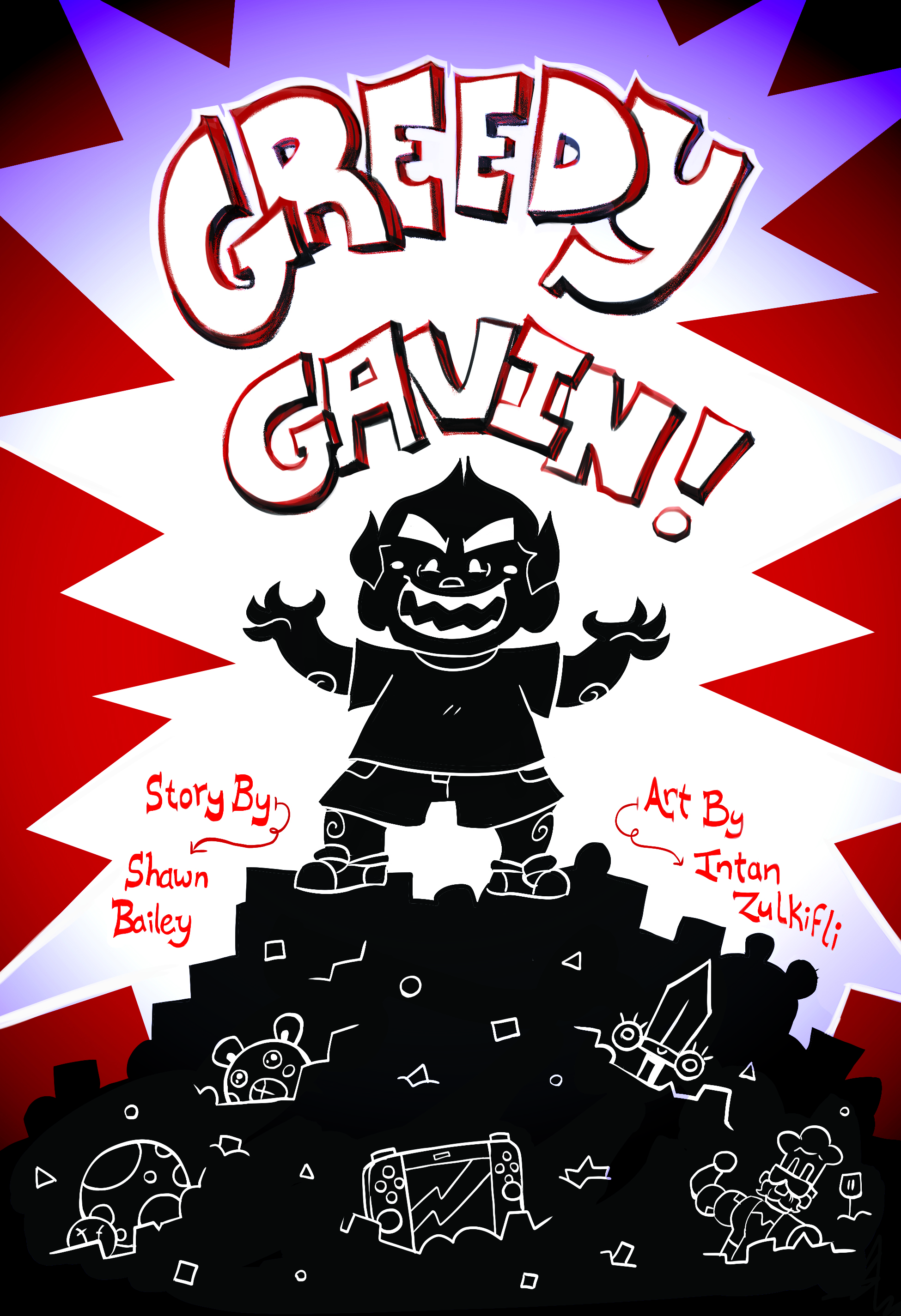 The story follows Greedy Gavin and his poor sister, Sweet Celia on a wacky tale of grouchy entitlement. Will Greedy Gavin change his ways, or will his greed consume him and every innocent bystander? Read the book to find out!